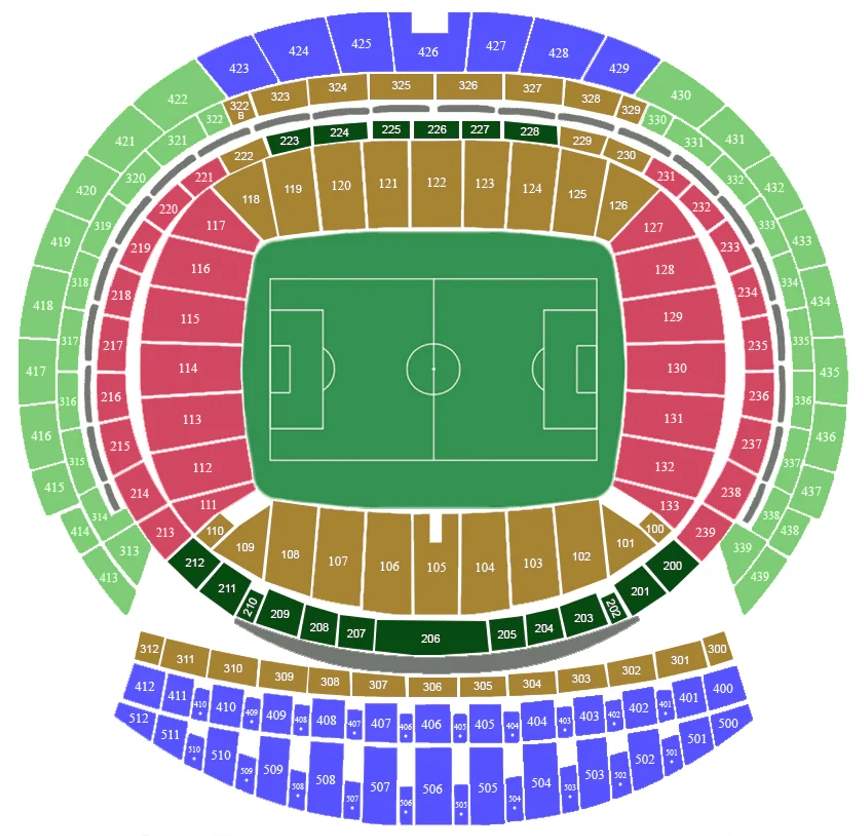 Tribunerne er inddelt i tre primære niveauer: et nedre niveau (Grada Baja), et mellemniveau (Grada Media) og et øvre niveau (Grada Alta). Hvert niveau er yderligere opdelt i nummererede sektioner (sectores). Din billet viser sektionsnummer, række (fila) og sædenummer (asiento), som guider dig til din specifikke plads.